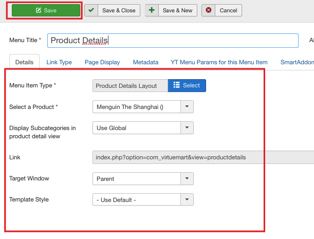 Mouse over VirtueMart dropdown and select Product Details Layout from the list. Once selected, the details tab display changes, see the screenshot below: