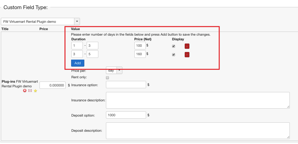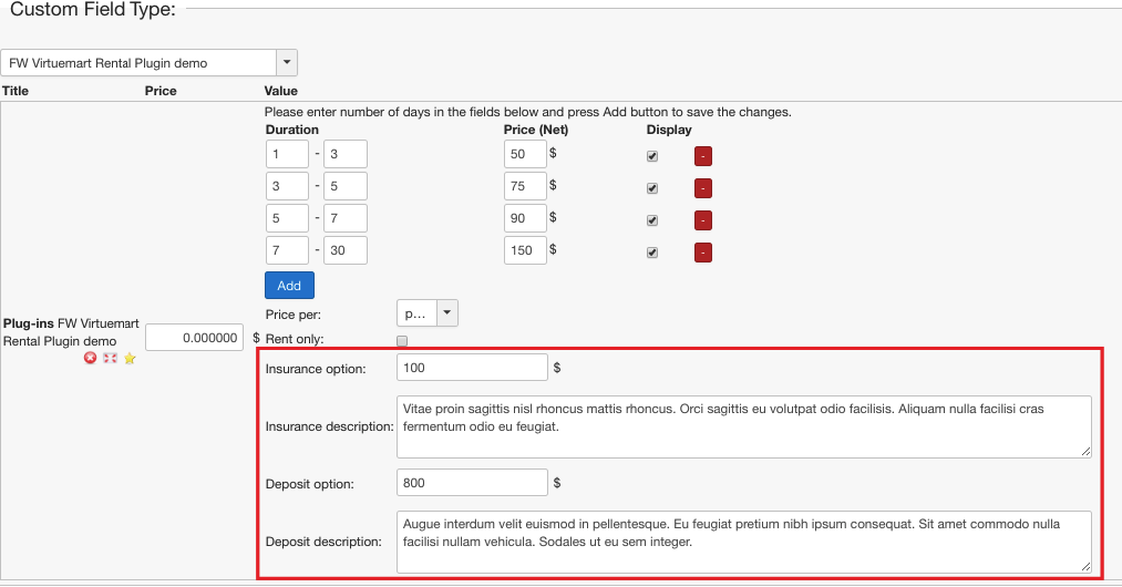 In some cases, security deposit and/or insurance amount is predefined by rental terms. FW VM Rental plugin allows to specify deposit and/or insurance amount in the Custom field section of the product settings. Additionally, you can specify here your deposit/insurance terms in the description field available for each option. -https://demo.fastw3b.com/vmrental/administrator/index.php?option=com_virtuemart&view=product&task=edit&virtuemart_product_id=1.