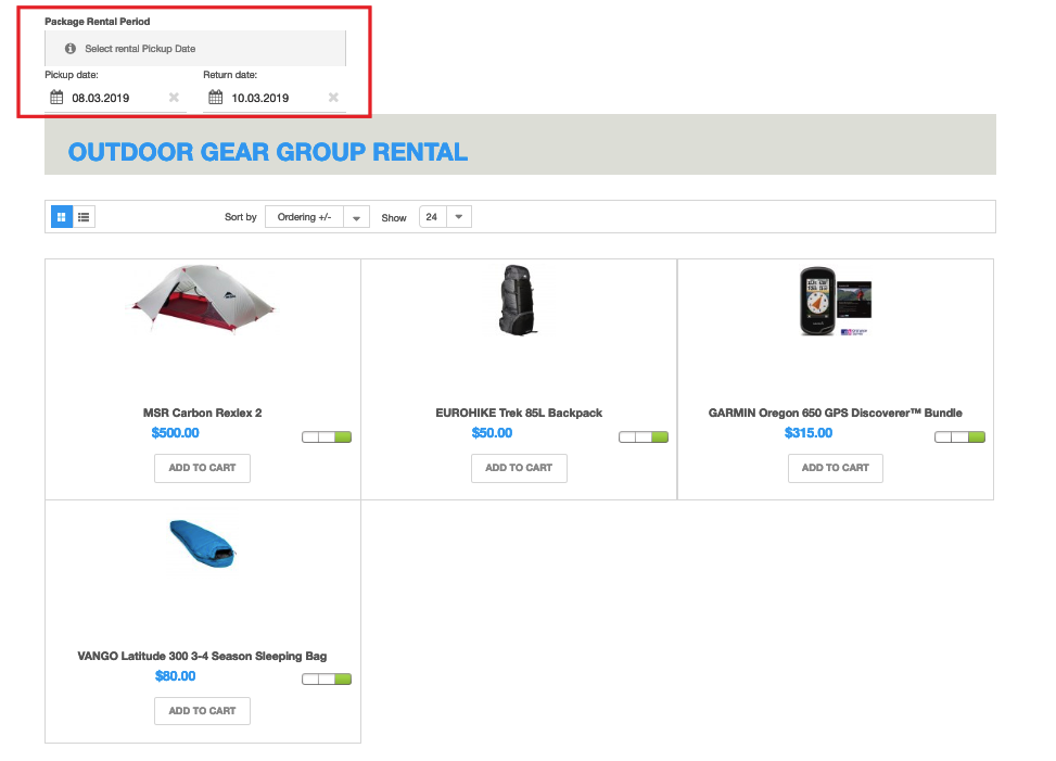 Our showcase is dedicated to package rentals. FW VM Rental Dates Module allows for quick renting of several products at a time, on the same dates. Thus, once the dates are entered within the module, they are automatically filled within the plugin for each particular product, and the total rental price gets automatically calculated as well. So you don’t need to rent out each product one by one.