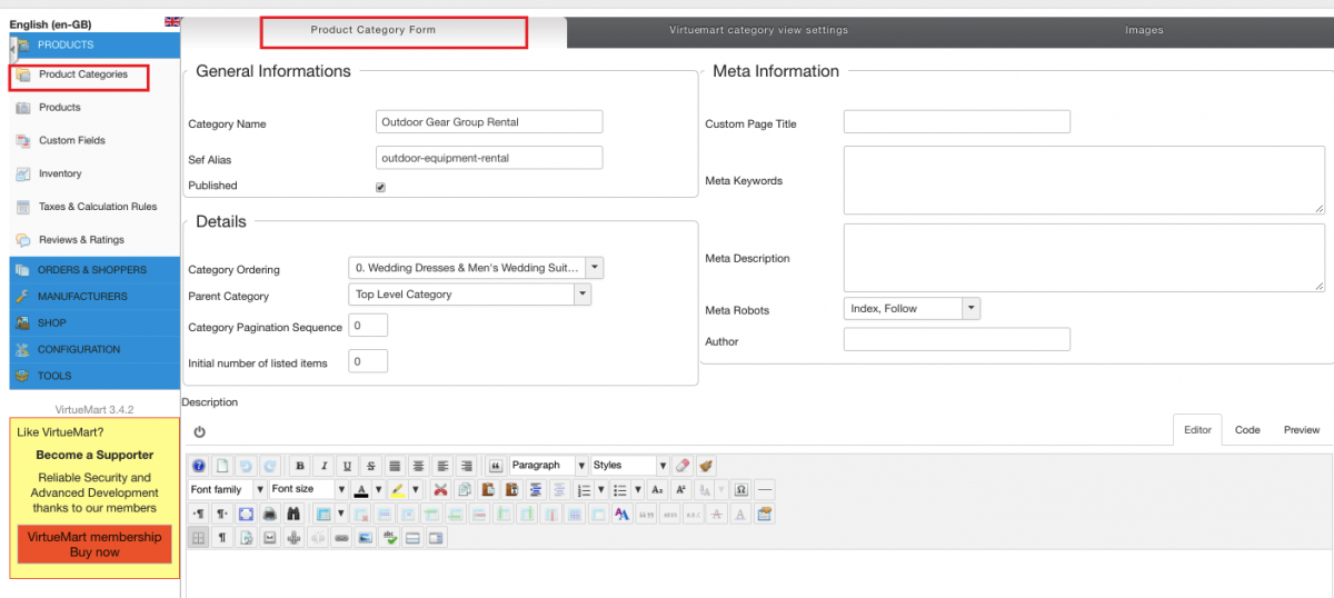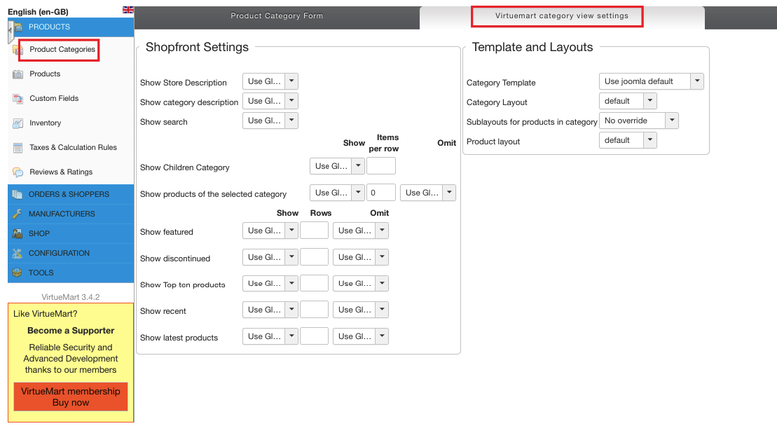 Locate Product Categories section on VirtueMart control panel.