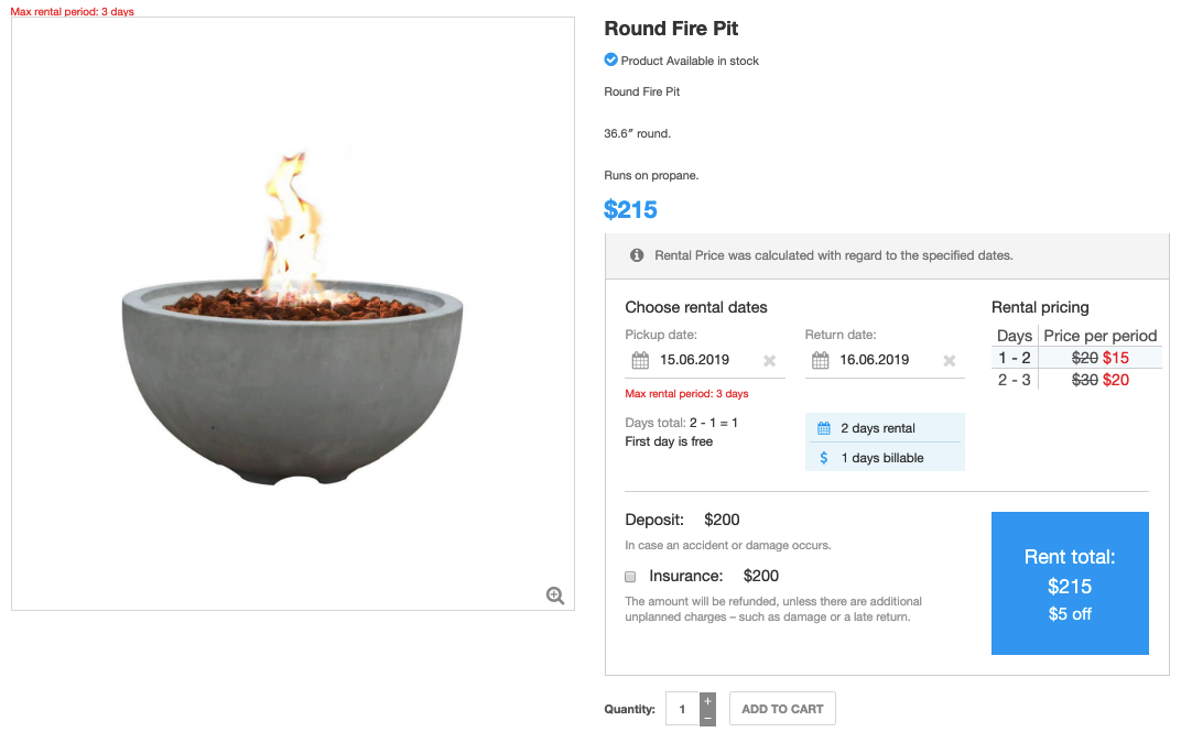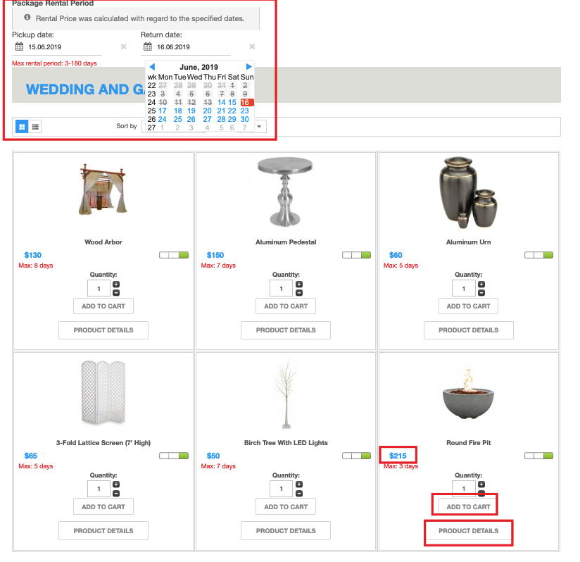 Enable package rental functionality for your Party Rentals using Rental Dates Module. Rental Dates Module allows for a quick booking of multiple products at a time for the same dates. Once the dates are entered within the module calendar fields, they are automatically filled within the plugin for each particular product. Consequently, the total rental price gets automatically calculated and displayed right on the category page along with Add to cart button and View details button.