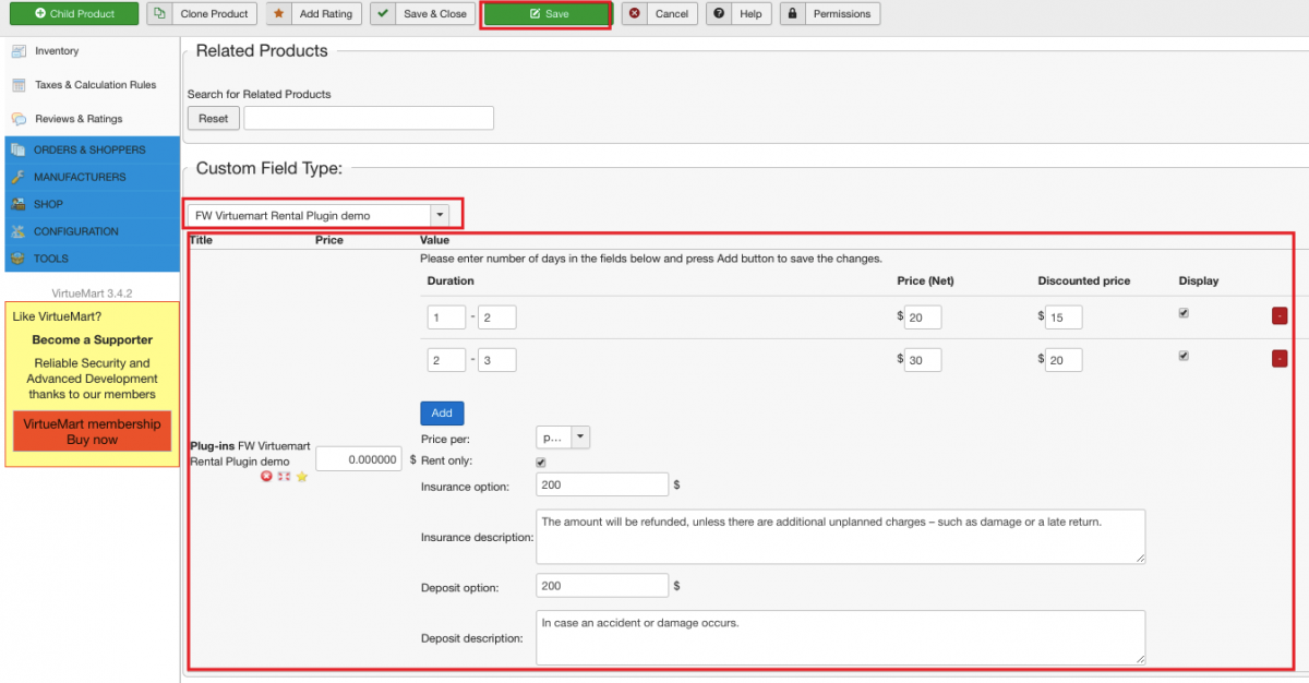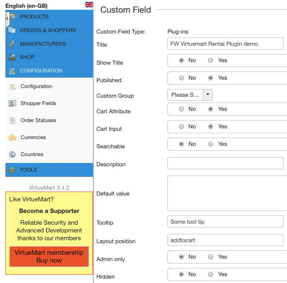 FW Virtuemart Rental plugin works in pair with VirtueMart component. In order to connect FW Virtuemart Rental plugin to VirtueMart component, you need to create a custom field with Plugins type.