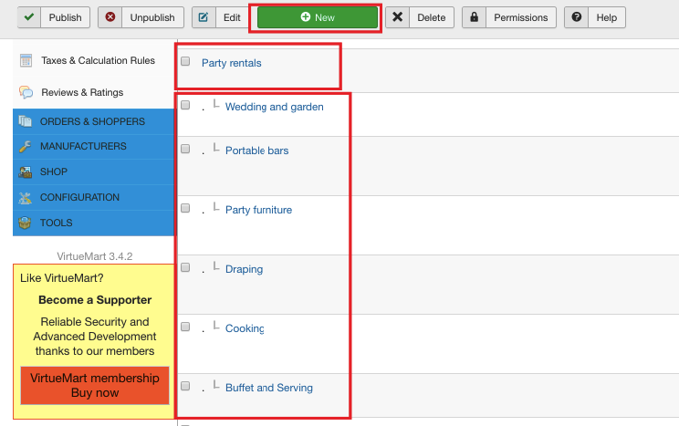 To create the website structure similar to our demo, create a parent category with its child categories. We created the Party rentals parent category with the following child categories - wedding and garden, portable bars, party furniture, draping, cooking, buffet and serving. The number and titles of the categories may vary upon your business model. The overall process for adding a category is as follows:
