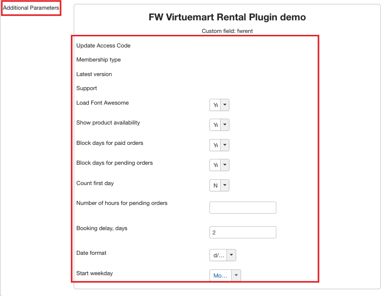 Select FW VM Rental Plugin from the list. The parameters in this section have the same values as in plugin configuration section so set all the parameters here, in Virtuemart, or go to the plugin configuration. To learn how to set FW WM Rental plugin parameters, review Plugin configuration tutorial.