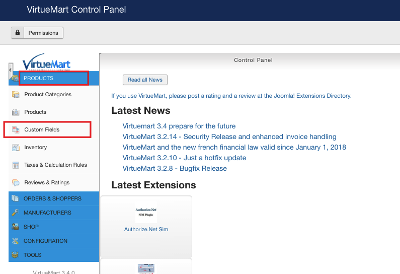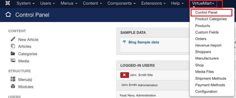Choose VirtueMart=>Control Panel from the list.